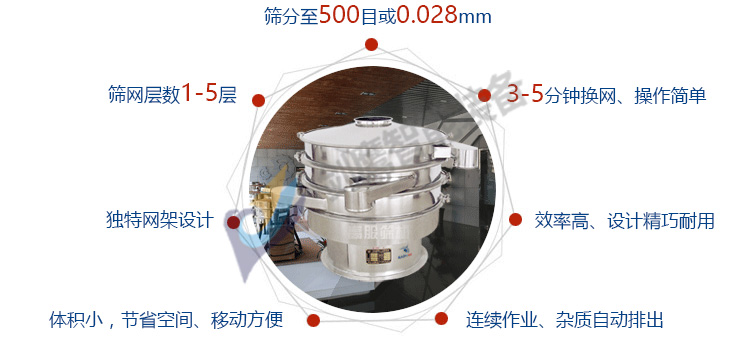 应用:针对粉状、颗粒状物料的筛选和分级,有独特的效果,广泛应用于食品、医药、化工、冶金等行业。 特点:任何颗粒、粉末、粘液一定范围内均可筛选。筛分细至500目或0.028mm, 过滤小可至5微米。分级筛选,可筛一至五层筛网,能同时进行二至六个等级的分选或过滤。效率高、设计精巧耐用,换网容易、操作简单、清洗方便。三元旋振筛杂质、粗料自动排出,可以连续作业。独特网架设计,筛网使用时间长久,换网快,只需3—5分钟。体积小,节省空间,移动方便。